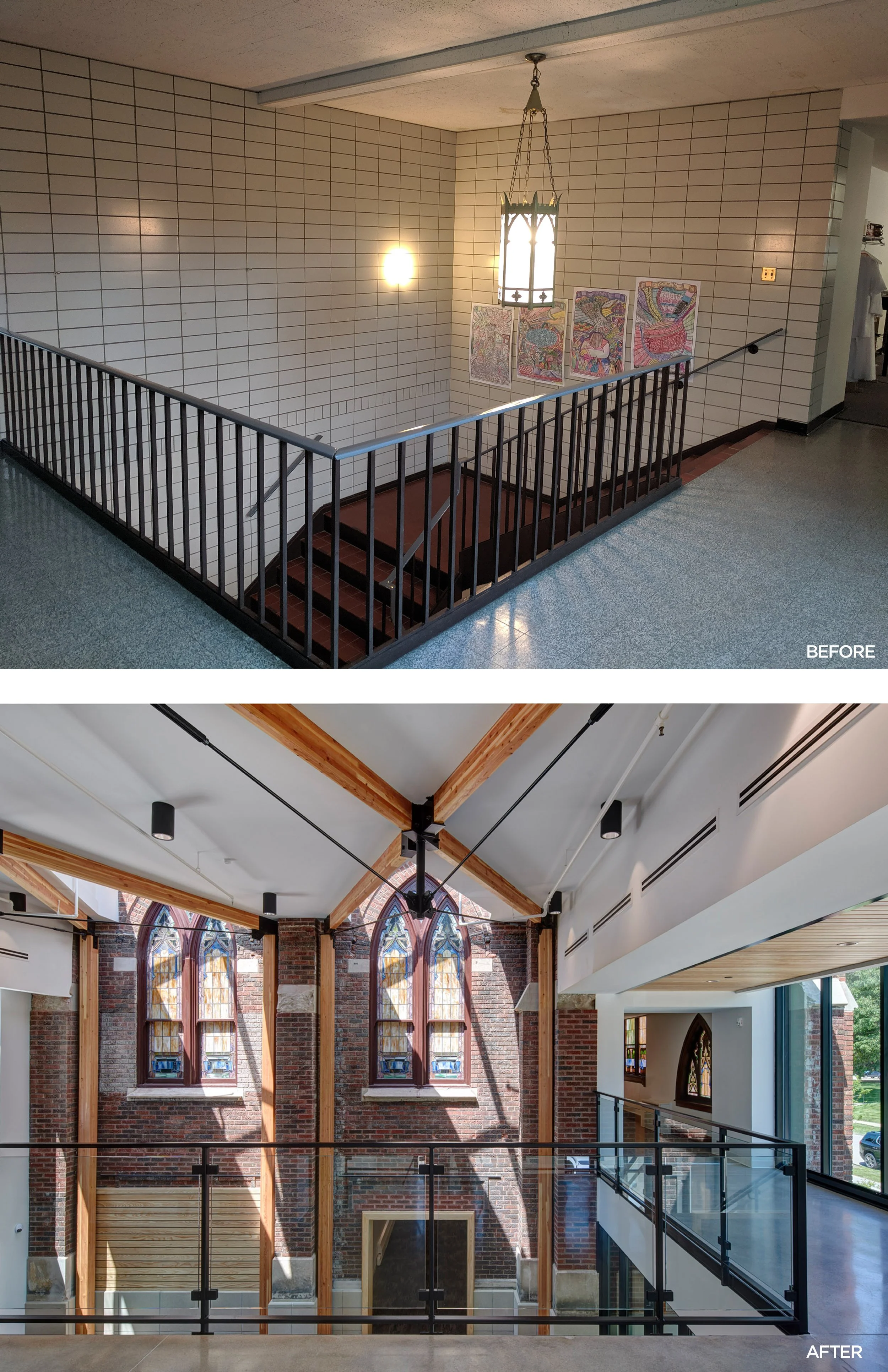 Each addition, on the East and West side of the building delicately touch the existing church and allows daylight to once again illuminate the original stain glass windows.