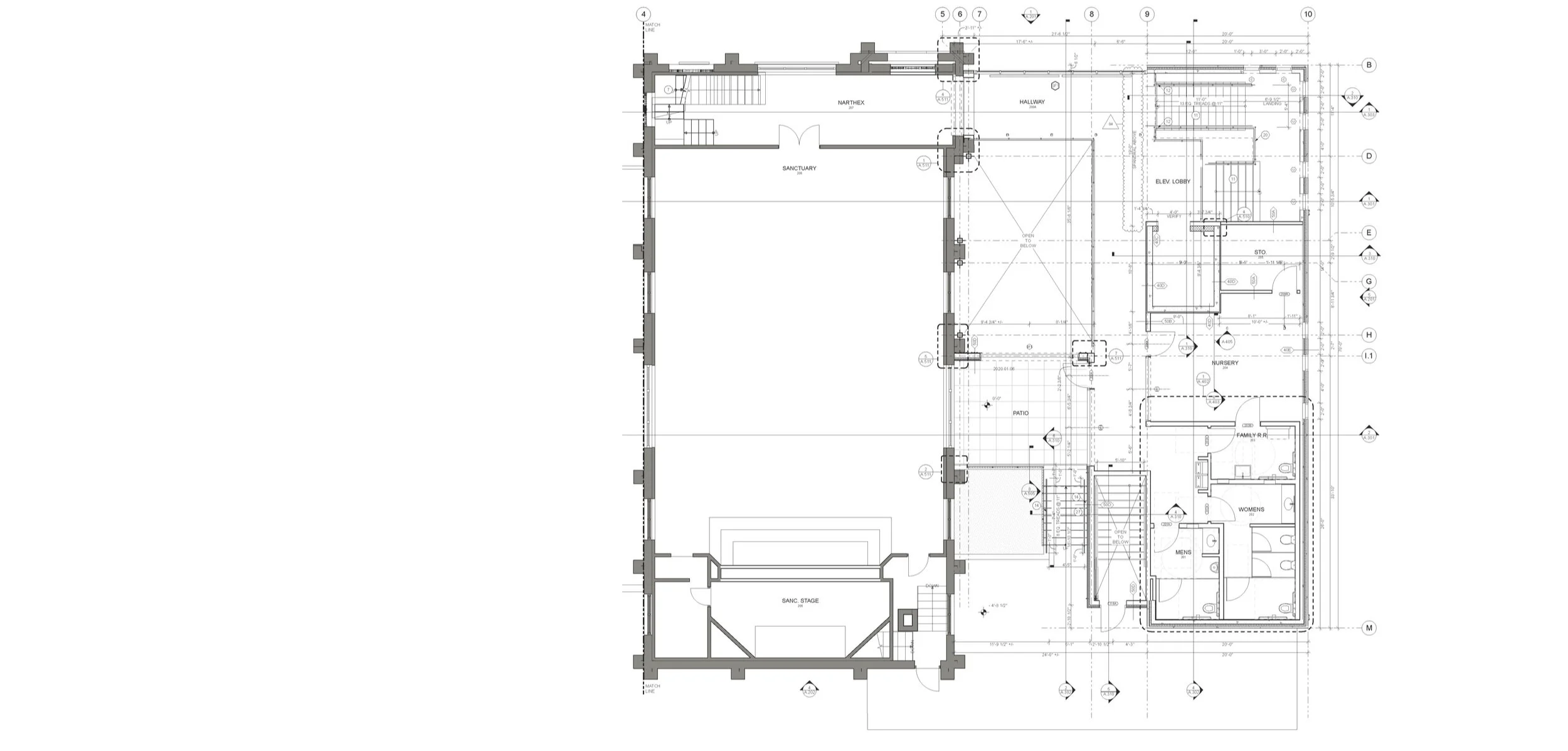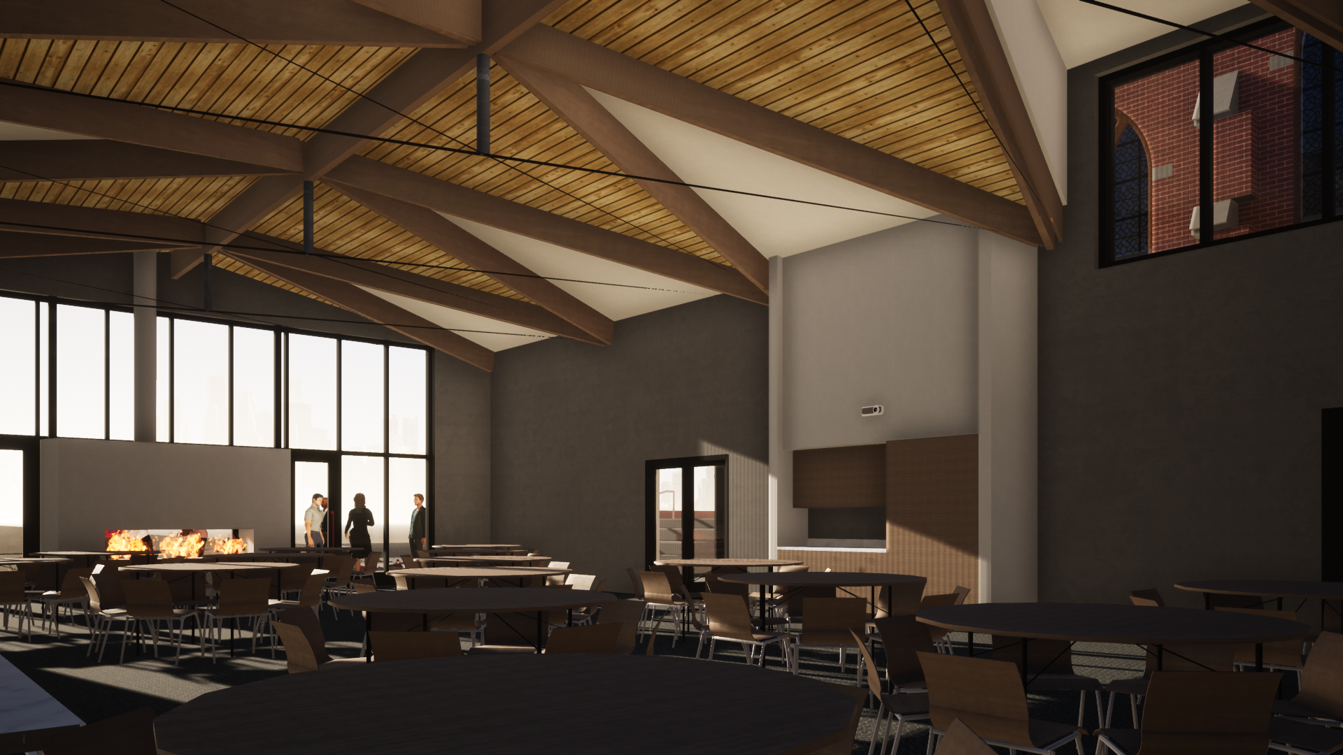 The Western addition provides a space for the congregation to gather for events, community engagement and for the University to use. The fireplace is a symbol of Hygge, the Danish tradition of warmth and family. It is double sided and engages the outside patio to extend out to the community and encourage them to cross the threshold. The first floor of the church was reorganized to provide rooms for religious education and connections to the East and West additions.