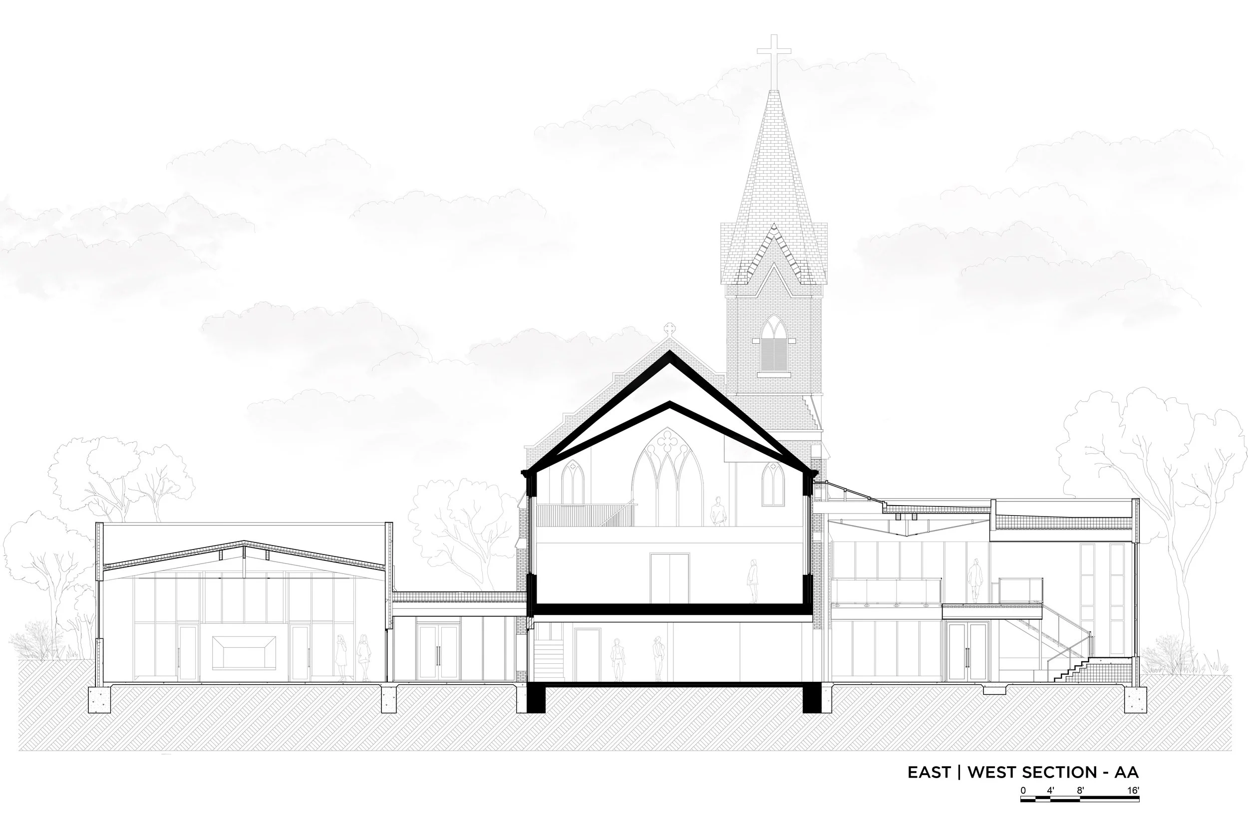 In Lutheran tradition, the church is seen as a vessel for their congregation, which is symbolized by the ships displayed within their sanctuaries. The Eastern addition alludes to the church’s history as well as this fundamental belief by using a bridge as the main source of circulation into the sanctuary. By winding the circulation through the addition and across the bridge, it symbolizes the path to embarking a vessel before its voyage.
